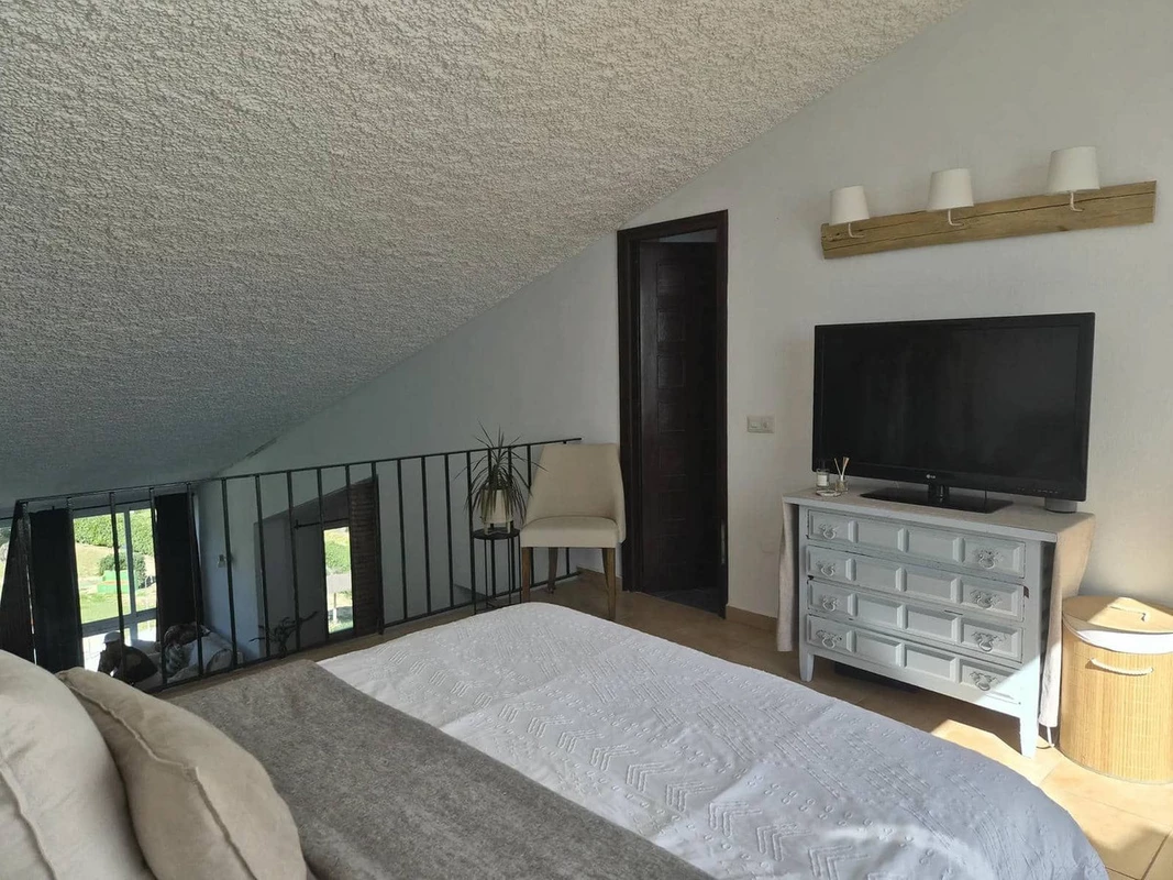 Upstairs, the generous bedroom offers built-in wardrobes and an adjoining bathroom. Elegant glass French doors open to stunning sea views, allowing you to wake up and enjoy the Mediterranean from the comfort of your bed.
