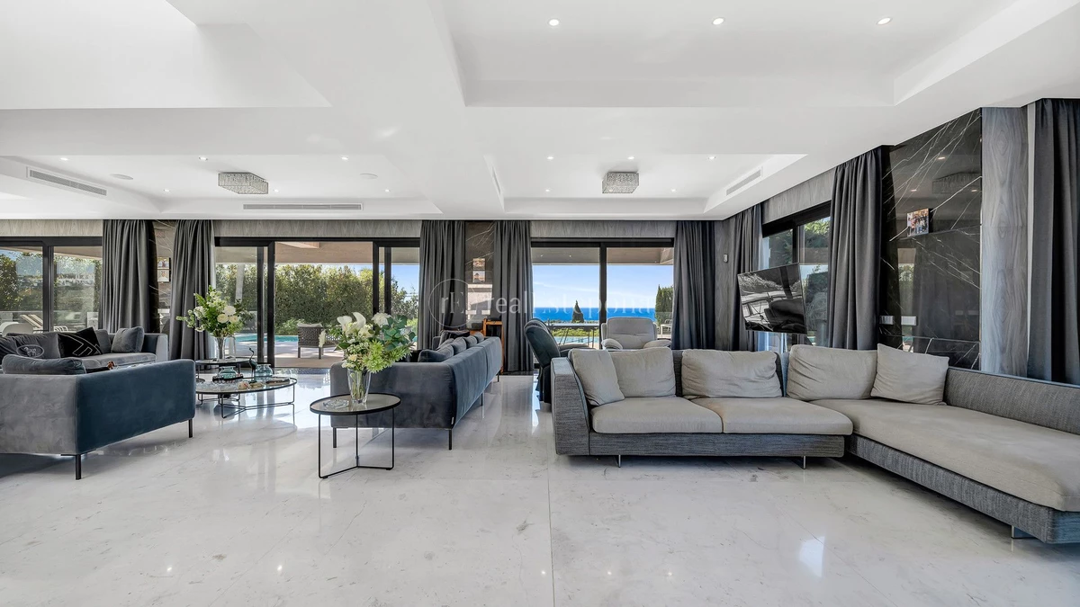 Upon entering the villa, you are welcomed into spacious open-plan reception areas with an elegant living room, dining area and a modern kitchen equipped with the finest appliances and features elegant dark tones contrasted by white marble-style countertops, all seamlessly connect to the large terrace overlooking the manicured gardens, perfect for enjoying the panoramic views. The property boasts nine en-suite bedrooms, with four located on the top floor, two on the ground floor, and a separate apartment on the lower ground floor. The latter includes three additional en-suite bedrooms, its own kitchen, and access to another terrace with wonderful golf views, ideal for guests or extended family.