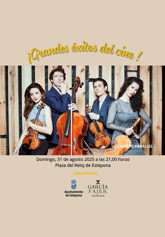 Estepona City Council informs that the García Fajer Foundation will present next Sunday, August 31, at 21:00 hours, in the Plaza del Reloj, the string quartet Parallel Quartet, formed by Alfredo Ancillo, violin; Laura Hidalgo, violin; Fatima Poblete, viola; and Stamen Nikolov, cello.
